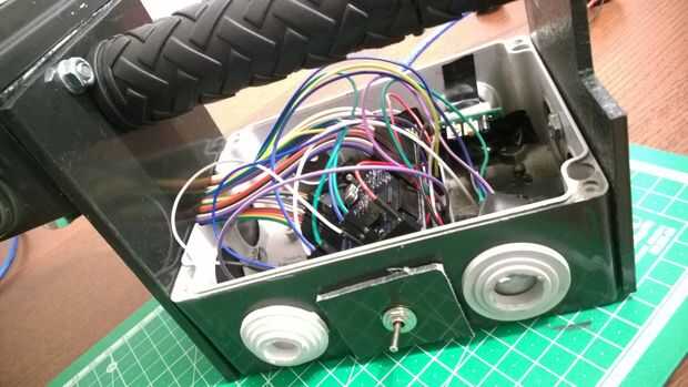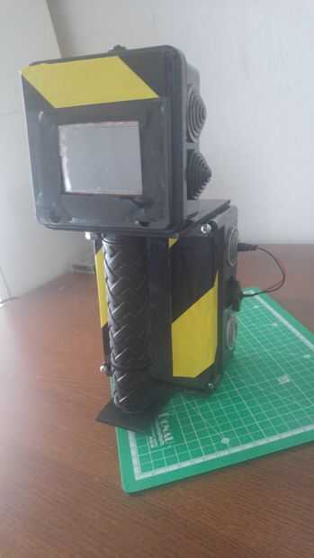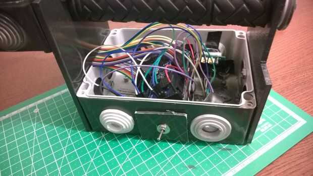 El primer paso fue el cableado. Era un poco minucioso trabajo. Porque no había tanto lugar y necesitaba poner cada cable de puente en el agujero correcto. Después de que i pone el zumbador y el sensor PIR izquierdo y derecho en la caja, conectar al arduino. Bueno saber estos sensores muy sensibles así que tuve que de alguna manera les eclipsan. Para eso utilicé las tapas de goma. He cortado un agujero en ellos que ver en las fotos. He arreglado los sensores con alguna cinta eléctrica. También usé cinta eléctrica para fijar el módulo de utrasonic y el delantero sensor de PIR. Cortado a la mitad y vertical la bicicleta me agarra para el controlador. No me gusta perder usé la parte de agarre sin uso como espaciador para la pantalla en la caja más pequeña. Yo escondidos los bordes naranja de la pantalla con alguna cinta eléctrica negra. Pegué uno de la tapa de goma sin uso en la parte inferior del dispositivo, por lo que puede ocultar el extremo del tubo de pvc verde. Para la buena mirada pongo alguna cinta amarillo/negro en el dispositivo. Último paso fue desenchufar el conector usb y conecte el enchufe de la toma de poder masculino. Enciéndalo y comenzar el seguimiento de movimiento:)