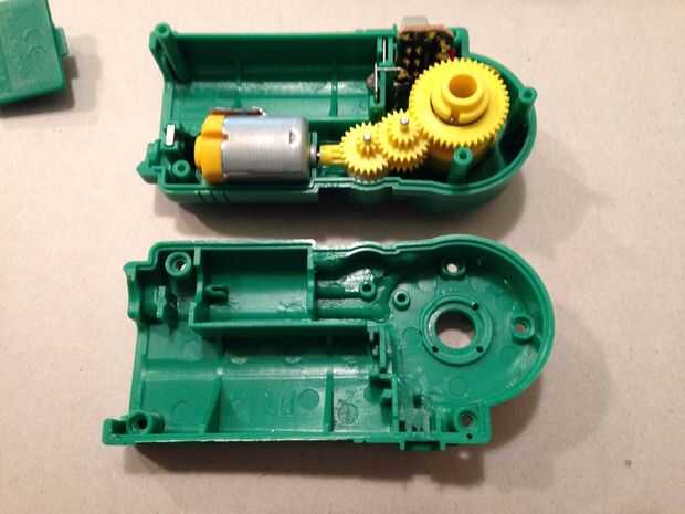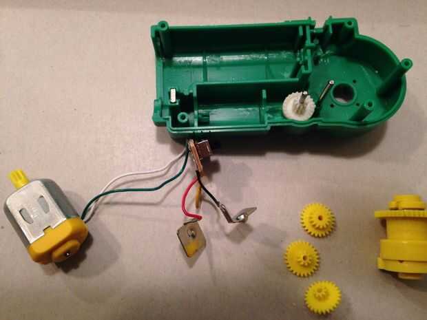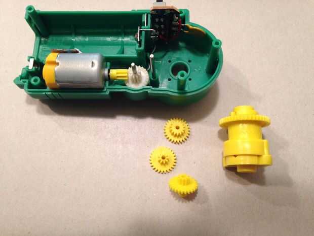 El siguiente paso es eliminar casi todo lo del motor de K'nex, para hacer nuestro trabajo más fácil. Retire los engranajes en primer lugar, tomando nota de que los engranajes van en qué eje y en qué orden. A continuación, retire con cuidado el motor, interruptor de montaje y placas de contacto de la batería. Usted puede ahora dejar de lado la K'nex cuerpo del motor y engranajes, como esta siguiente parte no tendrán.