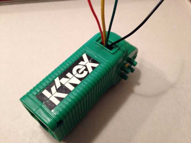 A continuación, ejecutar los cuatro de los cables hacia fuera el agujero donde el interruptor solía ser y ajustar las dos mitades del motor K'nex juntos. Puede que necesite utilizar un poco de fuerza para obtener las dos mitades juntas, debido a los cables de nuevo.