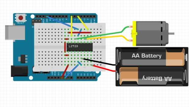 He incluido una imagen de Fritzing de mi circuito, que no debería ser difícil de seguir. Si desea ver la documentación para el L293D, Ud. puede chequear este sitio web para una hoja de datos y este sitio web si solo tienes el pinout.