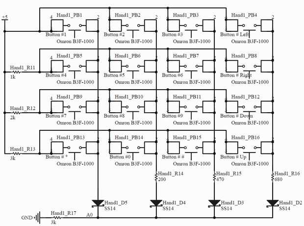 Hacer un teclado y utilizando un divisor de tensión para la son relativamente simple y se puede calcular todo fácilmente. El divisor de tensión se aprecia en los esquemas. El principio es muy simple, pero los valores reales raw_data (voltaje) que indican presionar otra tecla son ligeramente diferentes de los cálculos teóricos.