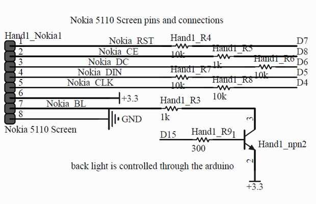 Pin 7 de pantalla controla la luz de fondo. Mediante la aplicación de 3.3V en el pin es encender la luz de fondo. He comprado varias pantallas de eBay (diferentes proveedores) y uno era diferente. Requiere que el pin debe ser conectado a tierra para activar la retroiluminación. La pantalla tenía ya resistencias en él, por lo tanto no era necesario el resistor de la serie (Hand1_R3). En el protoboard era fácil de ajustar, pero descubrí que después de ordenar el PCB, por lo tanto poco molesto.