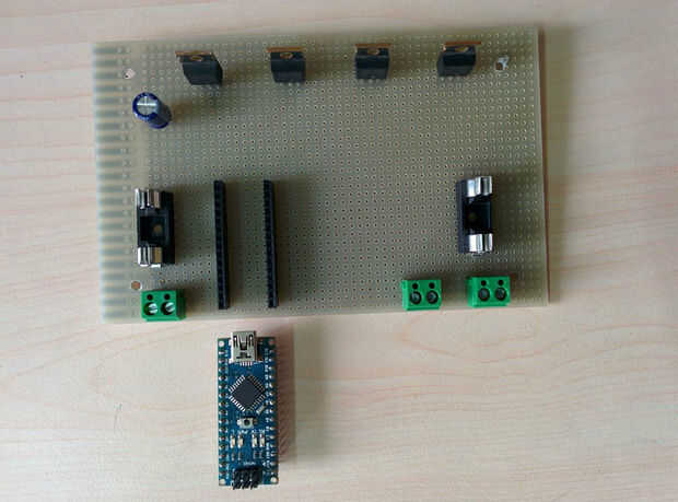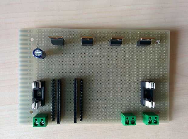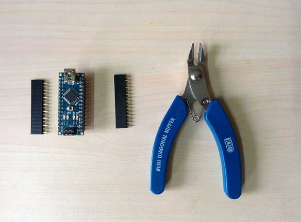 Luego soldar los pines header macho. Asegúrese de que la distancia entre los dos rieles ajusta el arduino nano.