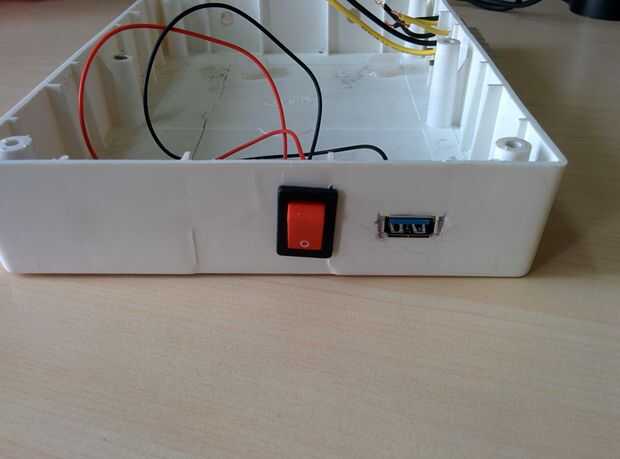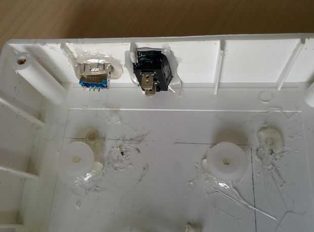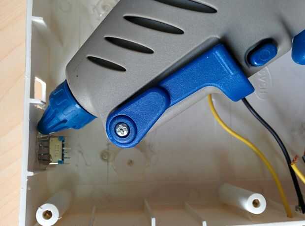 Inserte el puerto USB y cambiar en a las ranuras anteriores. Luego aplicar pegamento caliente alrededor.