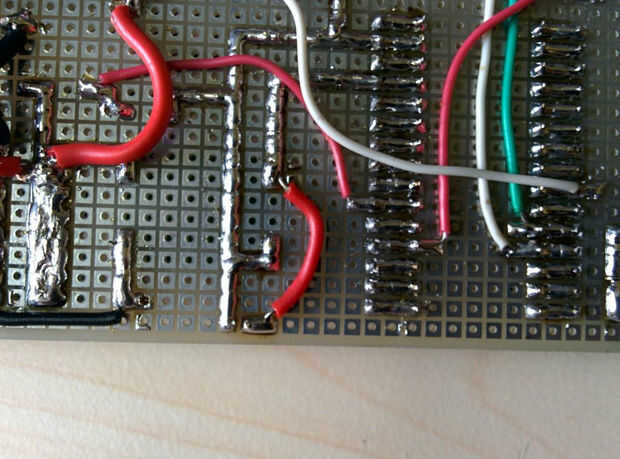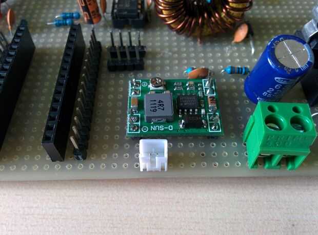 Soldar el conector JST macho cerca del convertidor del buck y conectar dos pasadores con el positivo (5V) y negativa