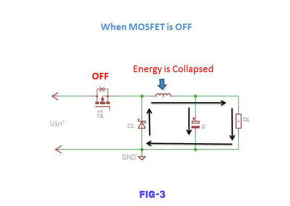 Cuando el MOSFET está apagado, la energía almacenada en el Inductor se contrae y corriente completar su camino a través del diodo (avance parcial) como se muestra en la fig-3. Cuando se desvanece la energía almacenada en el inductor, la energía almacenada en el condensador se suministra para mantener la corriente de carga.