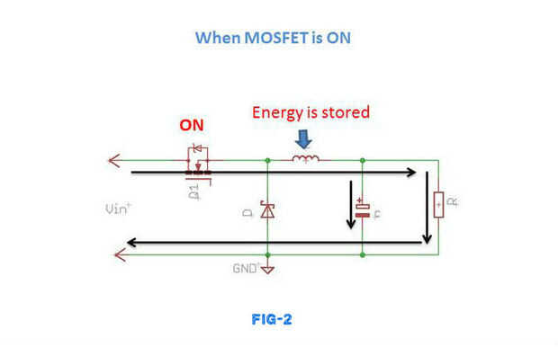 Cuando el MOSFET, la corriente fluye a través del inductor (L), (R) de la carga y el condensador de salida (C) como se muestra en la fig-2. En esta condición el diodo es reverse sesgada. Tan ninguna corriente fluye a través de él. Durante el estado magnético energía se almacena en el inductor y la energía eléctrica se almacena en el condensador de salida.