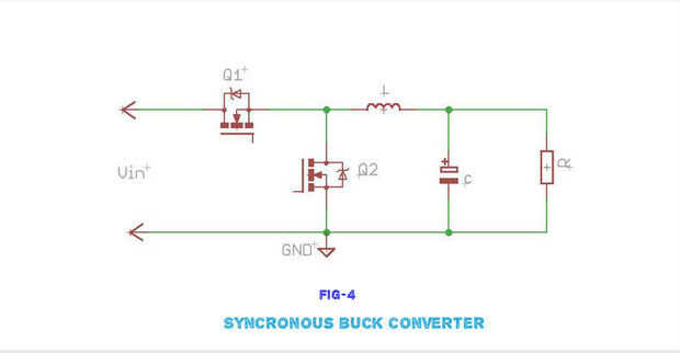 En la topología anterior el diodo utilizado tener una cantidad considerable de tensión de caída que redujo la eficacia de la convertidor.to mejorar la eficiencia de que un interruptor de electrónica de potencia se utiliza en su lugar. Por lo tanto un convertidor buck síncrono es una versión modificada de la topología de circuito de convertidor de buck básico en el cual el diodo, D, se sustituye por un interruptor de electrónica como MOSFET (Q2). Se muestra en la fig-4.