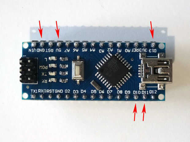 7. Cuadro 5 muestra que son la tierra, 5V potencia, Digital 10, 11y 13, pines del Arduino Nano