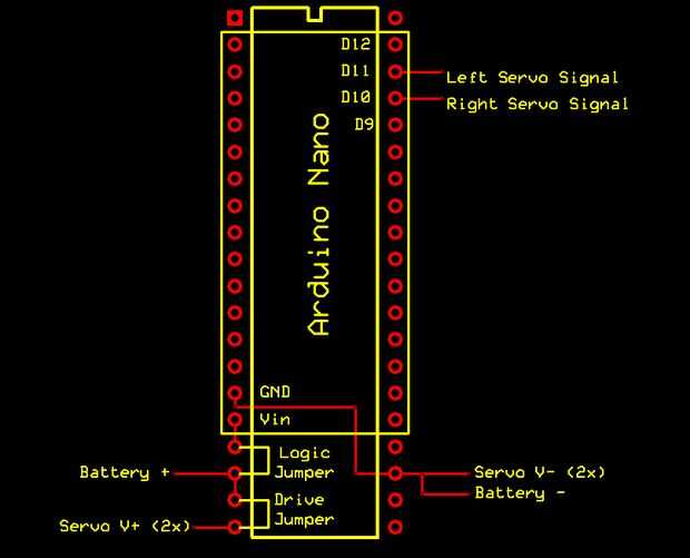 En mi caso había conectado los servos en D11 y D10, pero puede utilizar cualquiera de las salidas PWM, como se muestra en la primera imagen a continuación. Entonces alambré la batería a un pin gratis en el zócalo entre alfileres que conectado a la potencia para el arduino (Vin) y los servos, por lo que pude cambiarlos enciende y apaga con puentes. Rompieron las patas de la toma hacia fuera para que sean fáciles de acceder para expansiones. Tenga en cuenta que esta colocación también hace los botones de conexión y reset USB de fácil acceso, en el extremo del robot.