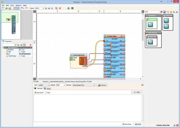 4. Conectar la clavija de salida "hacia fuera" del componente RealTimeClock1 en el "en" perno de la entrada del canal "serie [0]" del componente de Arduino (foto 3)