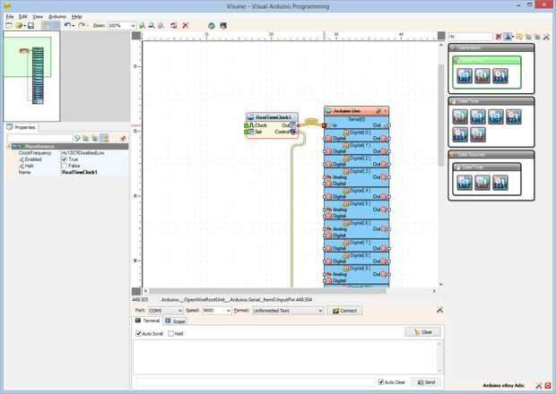3. Conectar la clavija de salida "hacia fuera" del componente RealTimeClock1 en el "en" perno de la entrada del canal "serie [0]" del componente de Arduino (foto 4)