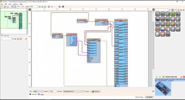En Visuino he cambiado junta a Nano y añadió mis componentes: DHT sensor y reloj RTC, pantalla LCD I2C. RTC y LCD conectados al puerto I2C, y DHT está conectado a 6 Digital.