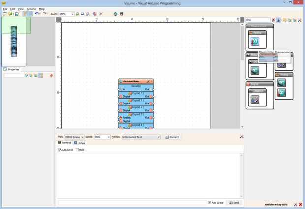 3. Conectar la clavija de salida "hacia fuera" del componente de termómetro en la "en" entrada de pin del canal serie [0] del componente de Arduino (foto 3)