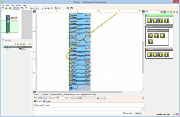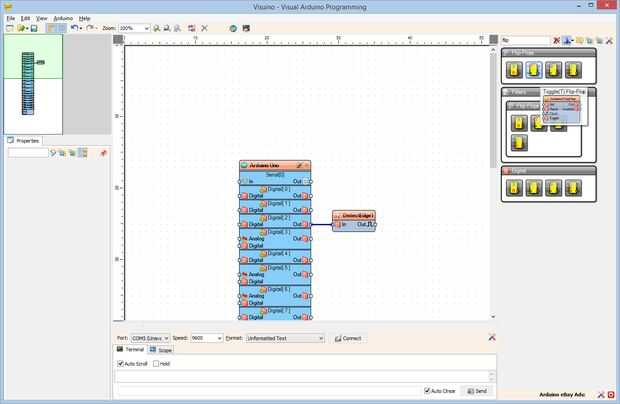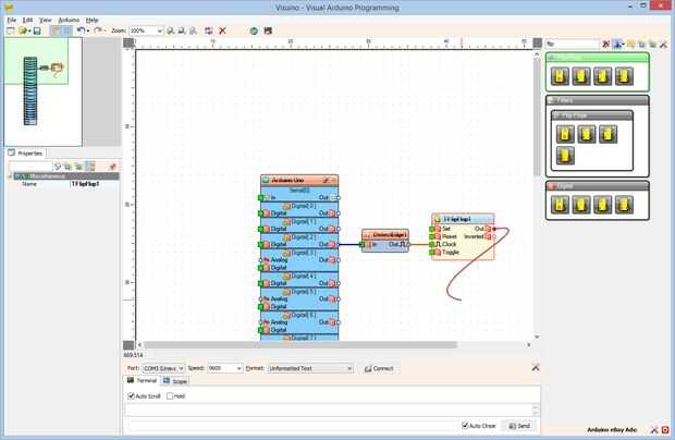 Componente TFlipFlop1(foto 3) con el conector de entrada "Digital" del canal de Digital [13] del componente de Arduino (foto 4)