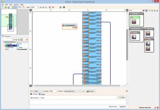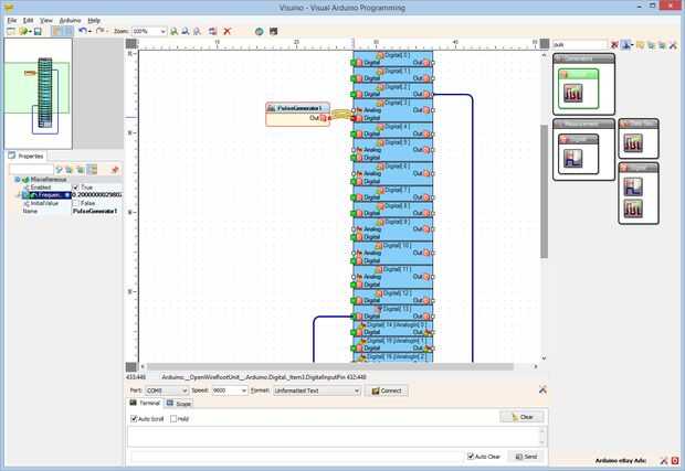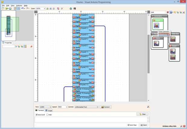 - Conectar la clavija "a" del componente PulseGenerator1 en la clavija de entrada "Digital" del canal de Digital [3] del componente de Arduino (foto 3)