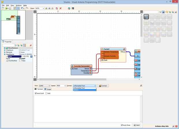 - En Visuino Seleccione el puerto y haga clic en el "formato:" desplegable cuadro y seleccione Packet1(foto 1)