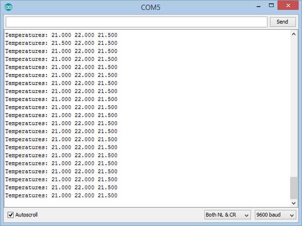 Si abres Terminal de serie en el IDE de Arduino o Visuino, ves la temperatura medida por termómetros (foto 2).