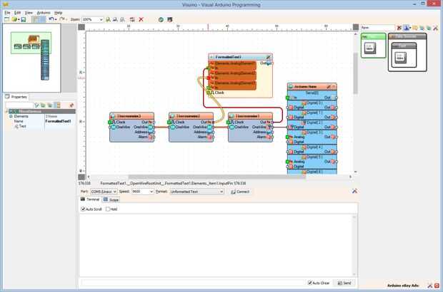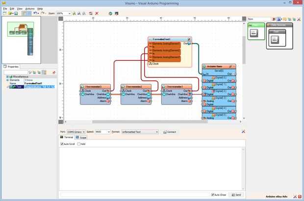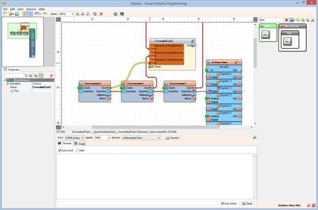 4. Conectar la clavija de salida "hacia fuera" del componente FormattedText1 en el "en" perno de la entrada del canal serie [0] del componente de Arduino (foto 4)