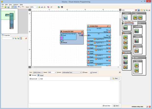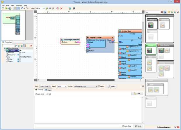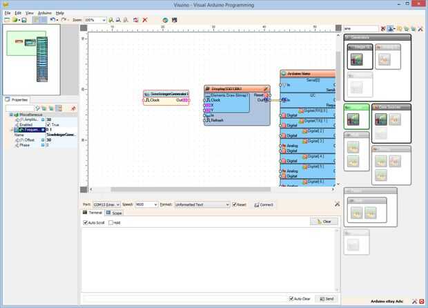 A continuación vamos a añadir generadores sinusoidales para control la X y Y pins que añadimos, de esta manera mover el mapa de bits en la pantalla: