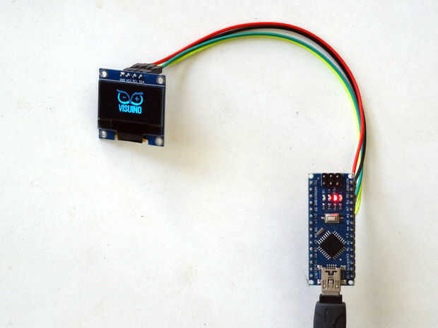 Foto 1 y el Video muestran la conectado y con proyecto. Podrás ver el mapa de bits moviéndose alrededor de la pantalla OLED como se ve en el Video.