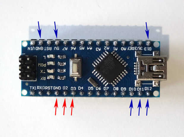 6. Cuadro 3 muestra en rojo dónde están los pernos de tierra, Digital 2y 3 digitales del Arduino Nano(en azul se muestran las conexiones en el paso anterior)