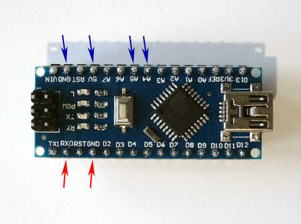 5. Cuadro 3 muestra en rojo donde el sueloy pernos de RX del Arduino Nano (en azul se muestran las conexiones en el paso anterior)