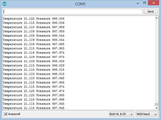 Si abres Terminal de serie en el IDE de Arduino o Visuino, se verá la temperatura y la presión medida por el sensor (foto 2)