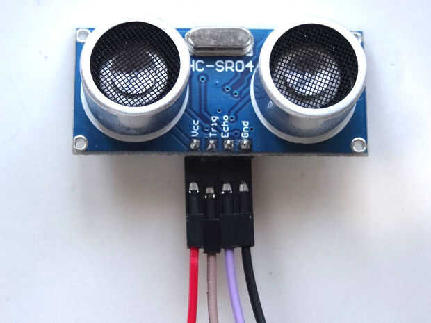 1. Conectar a tierra(cable negro), alimentación(cable rojo), gatillo(cable marrón) y eco(cable morado) para el módulo de Sensor de Ultrasonidos Ranger (foto 1)