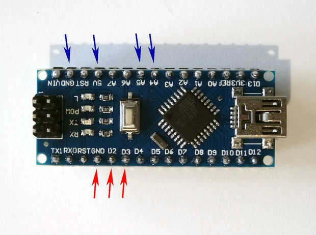 6. Cuadro 4 muestra en rojo dónde están los pernos de tierra, Digital 2y 3 digitales del Arduino Nano(en azul se muestran las conexiones en el paso anterior)
