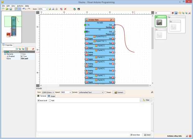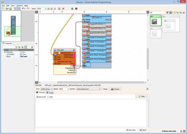Conectar la clavija "a" del canal "serie [0]" del componente de Arduino (foto 1) en la clavija de "en" entrada de la "Elements.File1" del componente SDCard1 (foto 2)