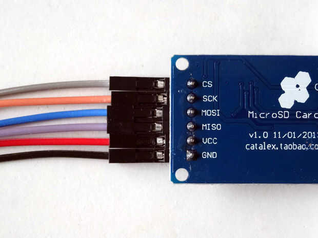 1. CS(Cable gris) Hembra-hembra, SCK(cable naranja), MOSI(cable azul), MISO(cable morado) y tierra(cable negro) se conectan al Módulo MicroSD