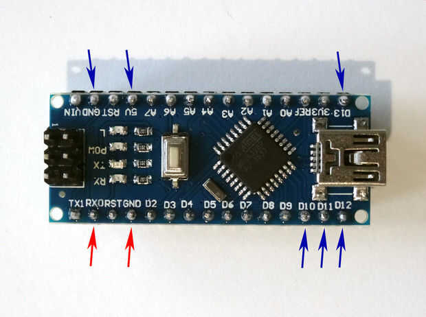 5. Cuadro 3 muestra en rojo donde el sueloy pernos de RX del Arduino Nano (en azul se muestran las conexiones en el paso anterior)