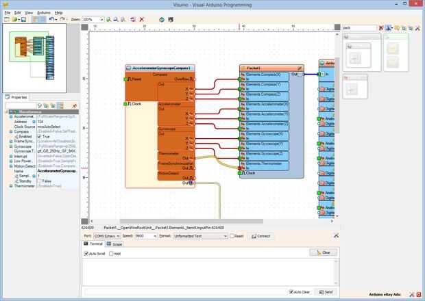 7. Conectar la clavija "a" del "termómetro" del componente AccelerometerGyroscopeCompass1 en el "en" el pin de la clavija de entrada de "Elements.Thermometer" del componente Packet1 (foto 4)
