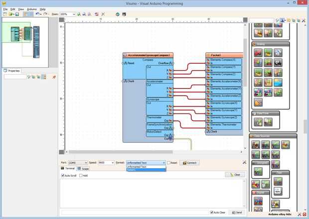 - En Visuino Seleccione el puerto y haga clic en el "formato:" desplegable cuadro y seleccione Packet1(foto 1)