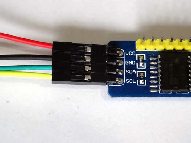 1. Conecte los cables de la Hembra-hembra - alimentación(cable rojo), tierra(cable negro), SDA(cable verde) y SCL(cable amarillo) el PCF8574/PCF8574A GPIO módulo (foto 1)
