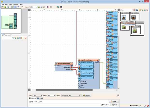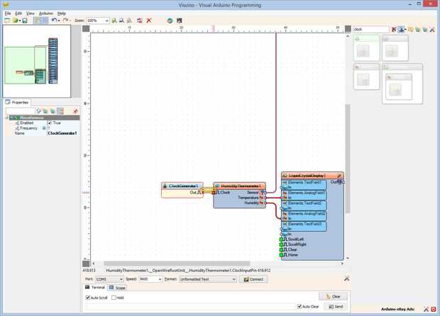 - Conectar la clavija "a" del componente ClockGenerator1 en la clavija de entrada de "Clock" del componente HumidityThermometer1 (foto 2)