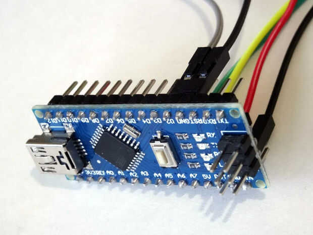 4. Cuadro 4 muestra en rojo donde el sueloy Digital 2 pines del Arduino Nano (en azul se muestran las conexiones en el paso anterior)