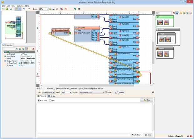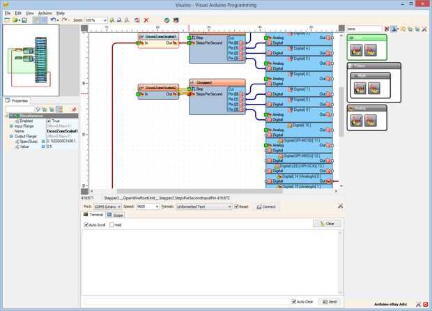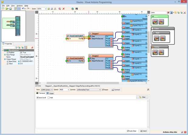 - Conectar la clavija de salida "hacia fuera" del componente DeadZoneScaled1 en la clavija de entrada de "StepsPerSecond" del componente Stepper1 (foto 2)