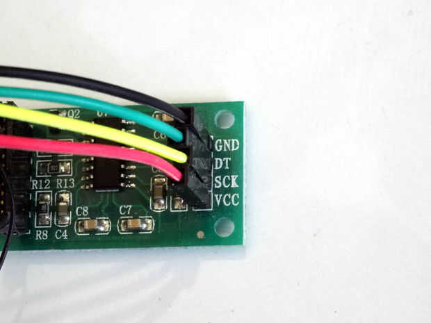 1. Conectar Alimentación de VCC de 5V(cable rojo), SCK(cable amarillo), DT(cable verde) y tierra(cable negro), el Módulo de Sensor de ADC de HX711 (foto 1)