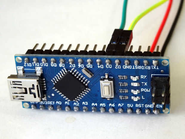 4. Conecte el otro extremo del alambre DT(cable verde) al pin Digital 3 de la placa de Arduino Nano (foto 3)