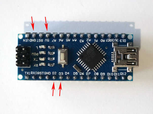 6. Cuadro 4 muestra dónde están la tierra, 5V potencia, Digital pin 2y el pin Digital 3, pines del Arduino Nano