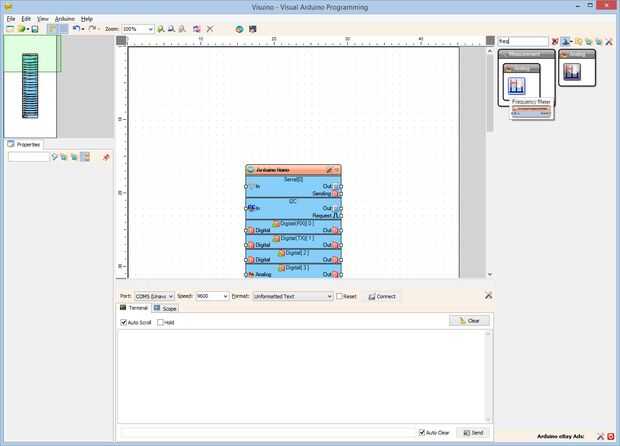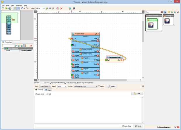 3. Conectar la clavija de salida "hacia fuera" del componente FrequencyMeter1en el "en" perno de la entrada del canal serie [0] del componente de Arduino (foto 3)