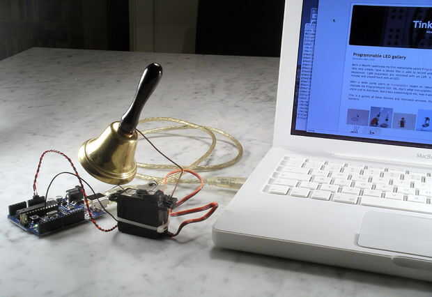 Es la primera vez, que he construido algo, que tiene partes móviles. Es el primer paso para cerrar la brecha entre lo virtual y el mundo real. Y fue muy fácil, el código es sencillo. También la mayoría de las piezas estaban en mi cubo de basura, excepto la campana. Unir todo y esperando que alguien golpeó mi blog eran divertido.