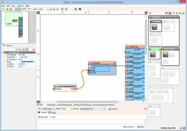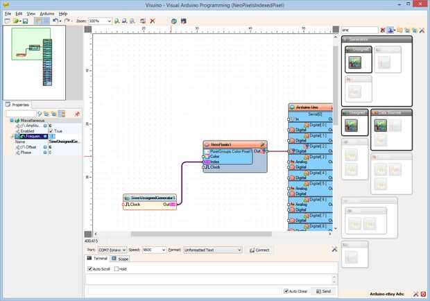 2. Conectar la clavija "a" del componente SineUnsignedGenerator1 en la clavija de entrada de "Índice" de la "Color Pixel1" del componente NeoPixel1 como se muestra en el cuadro 2