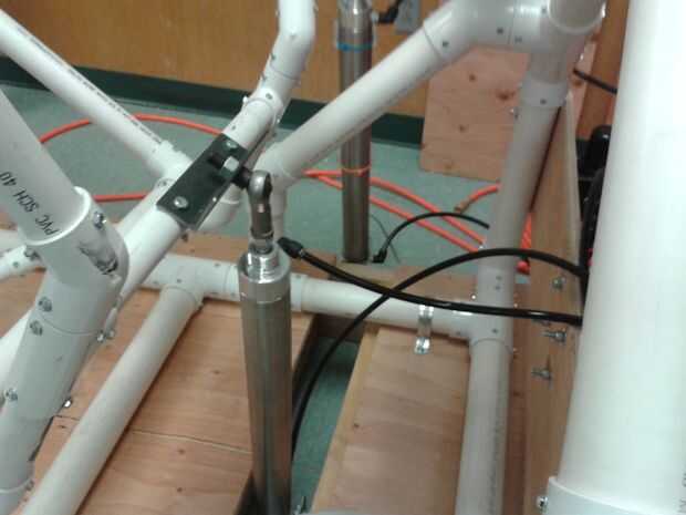 Queríamos que nuestro simulador de vuelo a 40 grados de inclinación de todos los lados. A través de simples cálculos trigonométricos, pudimos concluir que a fin de poder lograrlo, necesitaríamos aproximadamente un 18" cilindros de carrera. Nuestro cilindro tenía un 1" diámetro conectado a un hierro común toma de bola. Los cilindros neumáticos se basan en plataformas de bisagra de acero que se atornillan en la base y el cilindro sí mismo.