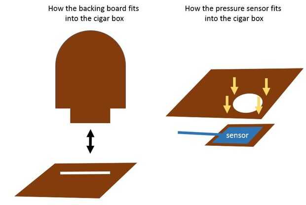 Quería que el sensor no tiene demasiada presión sobre ella ya antes alguien se presiona durante el 'juego'. Para conseguirlo libremente intercala el sensor entre una pieza cuadrada de madera de desecho y la caja y llevó a cabo la caja y la madera contrachapada con 4 tornillos. El sensor sí mismo no se atornilla en lugar. Permanece en su lugar porque hay un pedazo de cinta de doble cara sosteniendo y el cojín de hojas de oro juntas. Funciona bastante bien y sería fácil de desmontar en caso de desee un sensor diferente (tal vez conductancia?).