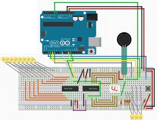 - PIN 14 del registro de desplazamiento 1 está conectado al pin 2 del segundo registro de cambio (esto es cómo la 'charla')
