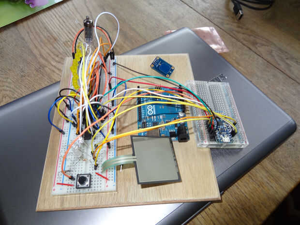 Hay 4 LEDs en la caja que no son controladas a través de registros de cambio. Uno se conecta a TrinketPro via pin 3 y uno a través del pin 4, y dos (en paralelo) conectan al pin 5. Se utilizan para indicar que el sistema está "midiendo" (pin 3), "wait" (pin 4) o "ready" (pin 5). Pin 5 recibe dos LED porque es en la caja como un indicador y uno está por debajo de la numitron para el ambiente.