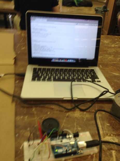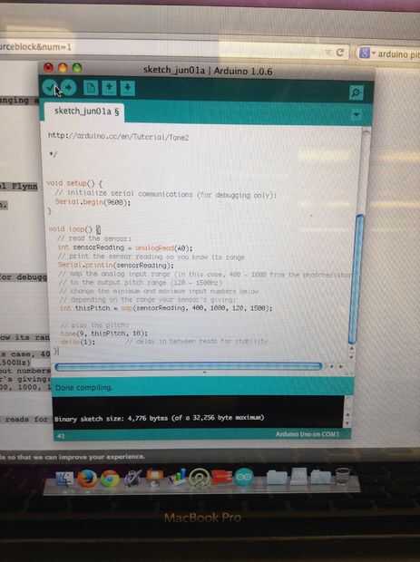 En este paso se necesita el arduino, portátil, cable USB, los cables de puente, las resistencias, el altavoz, la fotocélula y el protoboard. Utilizar el portátil para ir a "tono" arduino.cc y búsqueda. Donde se desea utilizar el "seguidor de pitch" para conseguir el código y diagramas esquemáticos. Después de que han subido el código para el arduino Verifique el cableado para asegurarse de que todos los cables estén colocados correctamente, porque si no luego no funcionará. Si el sonido no conseguir bastante fuerte, ajuste los valores de tono en el código.